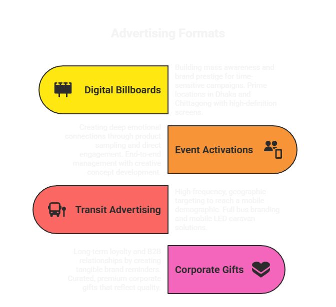 | Digital Billboards | Building mass awareness & brand prestige; time-sensitive campaigns. | Prime locations in Dhaka & Chittagong; high-definition screens; real-time creative flexibility. |